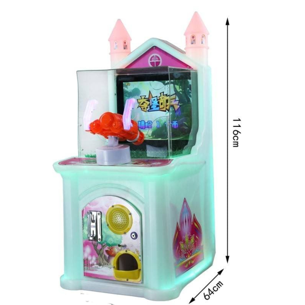 奪堡奇兵射水遊戲機:機台有四個關卡場景「海島探險」、「海洋探險」、「寶寶探險」、「森林探險」可以選擇, 水槍則會射出水,射向前方螢幕即可。 機台尺寸:寬55公分X深64公分X高116公分,重量:30KG。 機台螢幕:17吋。