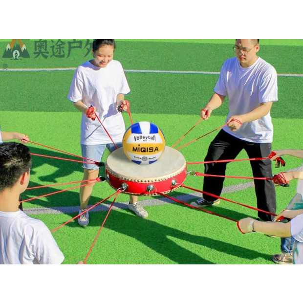 同心擊鼓:是一個多人團結的遊戲,需要大家同心協力拉緊繩子後,順利把球往上彈敲中心的鼓,看看大家的默契有多少囉。